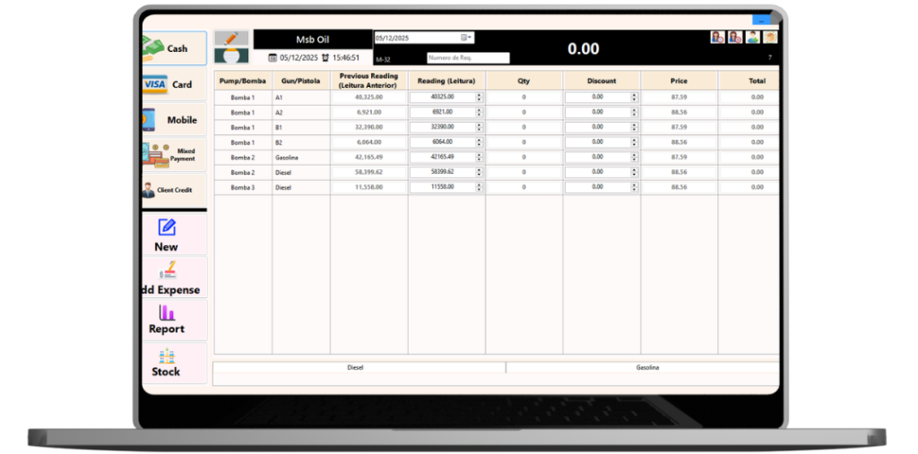 Fuel POS Module manages pump gun readings, liter tracking, tank stock, and end-of-day reconciliation for accurate fuel sales control.