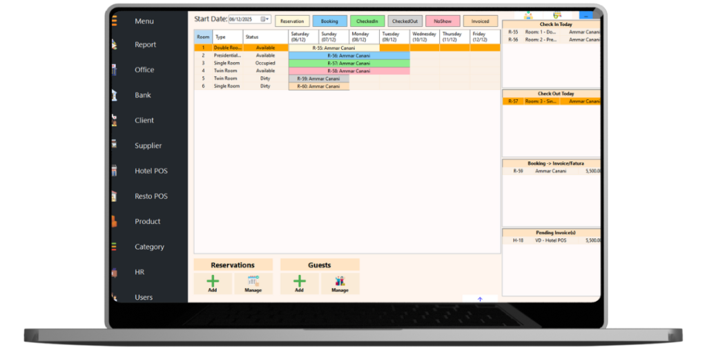 The Property Management System (PMS) manages room reservations, guest stays, check-ins, check-outs, invoicing, and client accounts, and connects directly to the One Click ERP for centralized control and reporting.